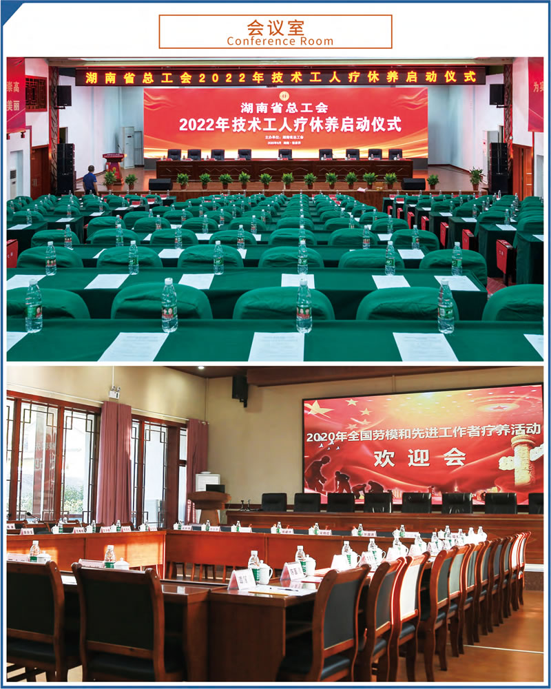 這里設(shè)施完備,環(huán)境優(yōu)美。占地70余畝,建筑面積23000余平方米,由多座湘西民族風(fēng)格的園林建筑群組成。院外依山傍水,院內(nèi)綠樹成蔭,環(huán)境優(yōu)美怡人,F(xiàn)有客房4棟,各類客房279間,中西餐廳可滿足500人同時就餐。大小多功能會議室、棋牌室、健身房、藍(lán)球場、羽毛球場等設(shè)施均有配備。