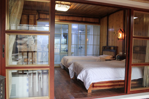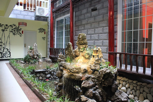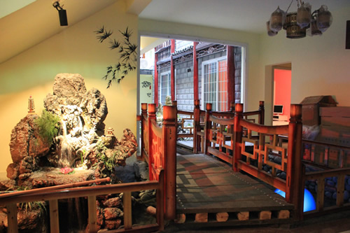 古樸的客房內(nèi),超大陽臺全景落地窗,是您欣賞沱江風(fēng)光帶首選客棧,兩座百年四合院內(nèi)小橋流水,假山錦鯉,一百三十平米休閑花園別具情調(diào)。紅酒加咖啡的大堂吧、彩色精致的情調(diào)房、古典高雅的臨江觀景房以及大型公共觀景平臺,龍閣的點點滴滴都透著出古城的神韻和幽靜,走進(jìn)龍閣客棧,給您一個完美的鳳凰古城沱江全景!