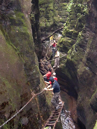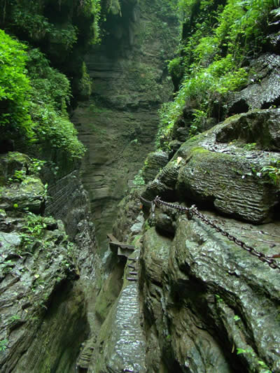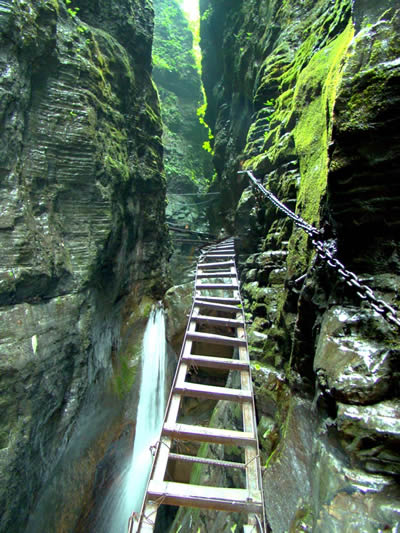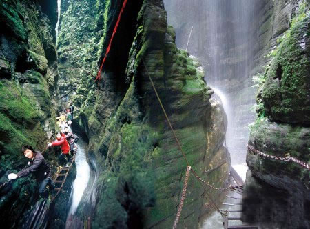 坐龍峽擁有中國第一條特種游道。所有游道均建于峽谷深處,依山取勢(shì),既經(jīng)細(xì)心雕琢聽卻又渾然天成。粗樸的板栗木棧道,可以讓你零距離的親近那一潭碧幽、聽聞山泉叮咚;精巧的跳墩,可以讓你媳戲流泉、觸感溪瀑;原質(zhì)的石坎道,讓你不得不調(diào)動(dòng)全部的身心能量悉心攀援、感悟峽谷;有驚無險(xiǎn)的鐵梯,讓你伴著腳下轟鳴的溪水,在驚怵中體味一份快慰。出口處的土家山寨,保留了古樸獨(dú)特的生活習(xí)俗。一塊臘肉就一口醇香的“苞谷燒”會(huì)讓你洗去所有的疲憊,在輕松中憨厚的主人向你講述過去強(qiáng)人出沒的故事......