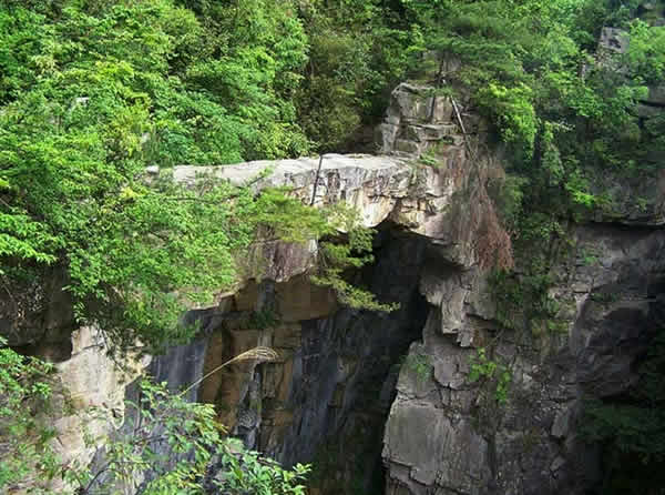 仙人橋又稱天下第一橋,坐落在猴子坡上、天子峰下的王爺洞對(duì)面。橋?qū)僮匀恍纬,長26米,寬1.5米,厚一米多,高約六七十 米,飛架在兩岸懸崖絕壁之上,鬼斧神工,惟妙惟肖,古人云:“天地可掬,此真天造也”。仙人橋?yàn)榧t砂巖結(jié)構(gòu),兩端生有高大的黃山松和杜鵑樹,濃蔭掩映,極其美麗。橋的東頭還有自然形成的石級(jí),人可順石級(jí)而下,走上天橋,下視萬丈深淵,令人頭暈?zāi)垦,非健壯者不敢逾越,旅游者無不贊嘆,說它是“天下絕景”。