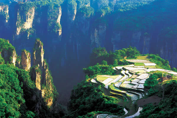 空中田園坐落在天子山莊右側(cè)經(jīng)老虎口、情人路方向兩公里處的土家寨旁,海拔1000余米。它的下面是萬丈深淵的幽 谷,幽谷上有高達(dá)數(shù)百米的懸崖峭壁,峭壁上端是一塊有3公頃大的斜坡梯形良田。田園三方峰巒疊翠,林木參天,白云繚繞,活像一幅氣勢(shì)磅礴的山水畫。登上“空中田園”。清風(fēng)拂袖,云霧裹身,如臨仙境,使人有青峰鳴翠鳥,高山響流泉,身在田園里,如上彩云間”之感。