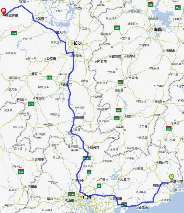 現(xiàn)在位置:張家界旅行社->交通指南->自駕車路線 -> 揭陽(yáng)到張家界旅游自駕車線路,揭陽(yáng)去張家界自己開(kāi)車要多長(zhǎng)時(shí)間,有多少公里