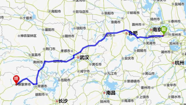 左右,沿途經過金壇——馬鞍山市——合肥——六安市——麻城市——仙桃市——潛江市——荊州市——常德市(這里可以不走常德,直接從荊州經澧縣、石門縣到慈利縣)——慈利縣——張家界。