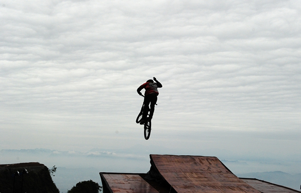 沿用去年的賽制,本屆大賽依舊分速度賽和技巧賽。速度賽的賽道出發(fā)點為天門洞口,選手將俯沖騎行整條天梯,并且全程直線加速,再騰空飛躍跨度超過7米、高差超過4米的跳臺最終騎行至天門洞廣場,時間最短者為勝。技巧賽為選手通過天梯上的加速跳臺起跳,跳臺呈現(xiàn)4.5米弧度仰角,選手會被拋至空中,完成后空翻、超人、神龍擺尾等難度動作,落地后,再通過2米高,跨度超過7米拋臺,空中完成第二次難度動作,裁判將以兩次空中動作難度和落地完成情況為基本項要求評分。