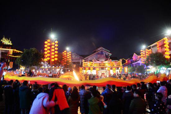 火龍出場,街區(qū)狂舞;盤龍點睛,眾人祈福。12月21日,農(nóng)歷冬至,當(dāng)天夜晚在旅游勝地張家界武陵源區(qū)溪布老街擺手堂廣場啟動的 “武陵腔調(diào):趕火趕戲趕大年”活動儀式上,一條全身似火的長龍在近百名土家兒女的舞動下 “閃亮”登場,格外耀眼。據(jù)了解,這條長龍身有香味,全長108米,是目前世界最長的香火龍。
